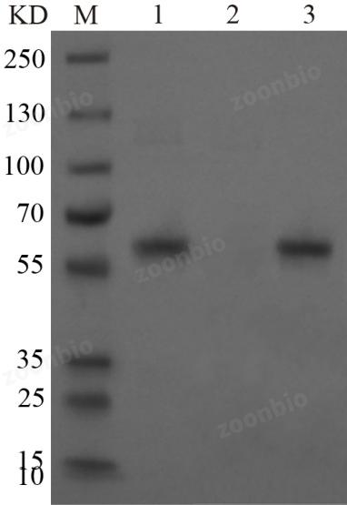 Lane M:PageRuler™ Plus 预染蛋白分子量标准(从上到下:250,130,100,70,55,35,25,15,10)