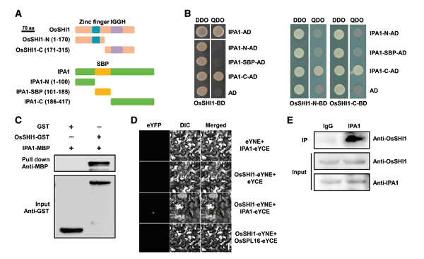 万建民院士课题组研究人员鉴定了一个新的水稻株型发育突变体shi1(shortinternode1),其分蘖数减少、茎秆粗壮并且穗分枝数显著增加。图位克隆结果表明,目的基因OsSHI1编码植物特异转录因子,主要在腋芽及幼穗中表达。研究人员通过酵母双杂交筛库鉴定出了一个重要的互作蛋白,IPA1(即理想株型调控因子OsSPL14)。IPA1对水稻株型发育的调控主要是通过调控下游关键基因OsTB1及OsDEP1来实现。有趣的是,在这两个基因的启动子中均发现OsSHI1识别基序的存在,并且OsSHI1可直接结合OsTB1及OsDEP1的启动子。在突变体shi1中,OsTB1及OsDEP1的表达水平显著上调。进一步研究发现,OsSHI1可降低IPA1对OsTB1及OsDEP1启动子的结合能力并抑制其对下游靶基因的转录激活活性,进而协同调控水稻株型的发育。